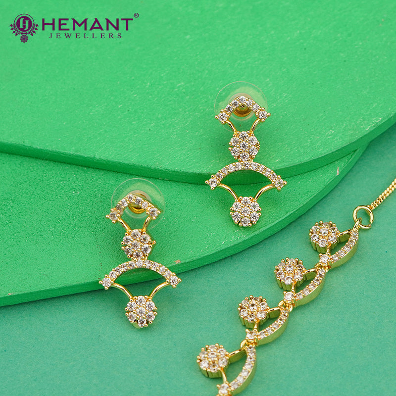 Add a graceful shimmer to your festive and formal looks with this elegant gold-finish necklace set. The design highlights a series of petite arched links, each suspending a sparkling CZ stone cluster that resembles blooming floral motifs. The perfectly symmetrical arrangement and fluid movement between elements make this set ideal for both sarees and Indo-western attire.
