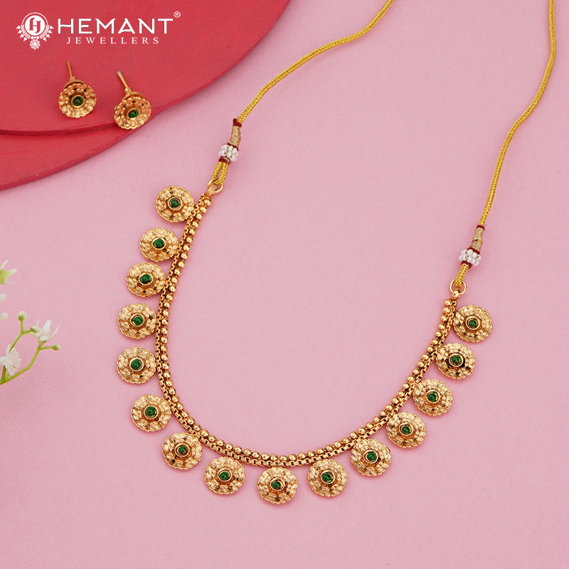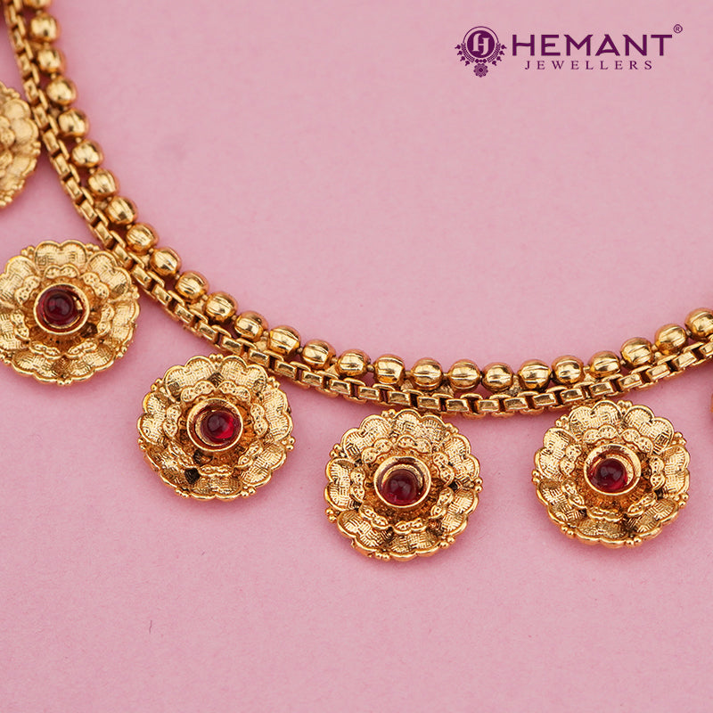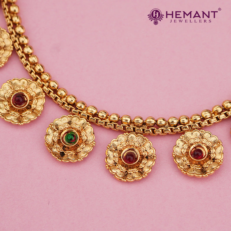 Add vintage charm to your festive look with this elegant floral coin necklace set. Designed with textured gold-finish round charms, each pendant features a raised floral pattern highlighted with alternating red and green stones. The layout offers a symmetrical, eye-catching display along a structured golden band.