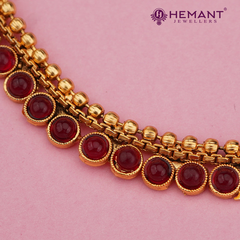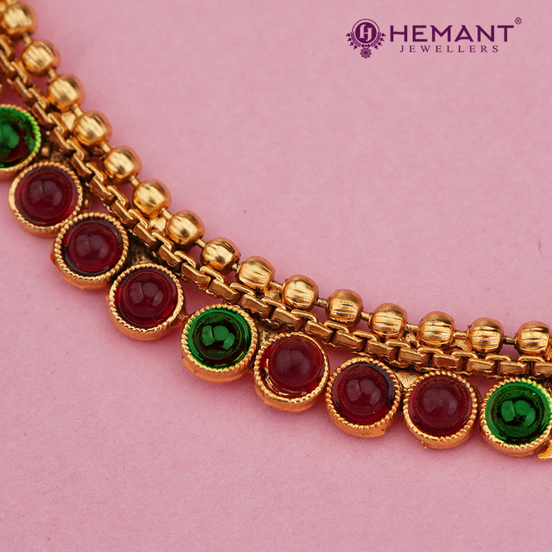 Unit price perMake a graceful statement with this refined necklace set designed in a gold-tone finish. The necklace features two neat rows of round-cut stones — alternating red and green — set on a structured curved band, accentuated with a beaded inner edge for depth and richness.