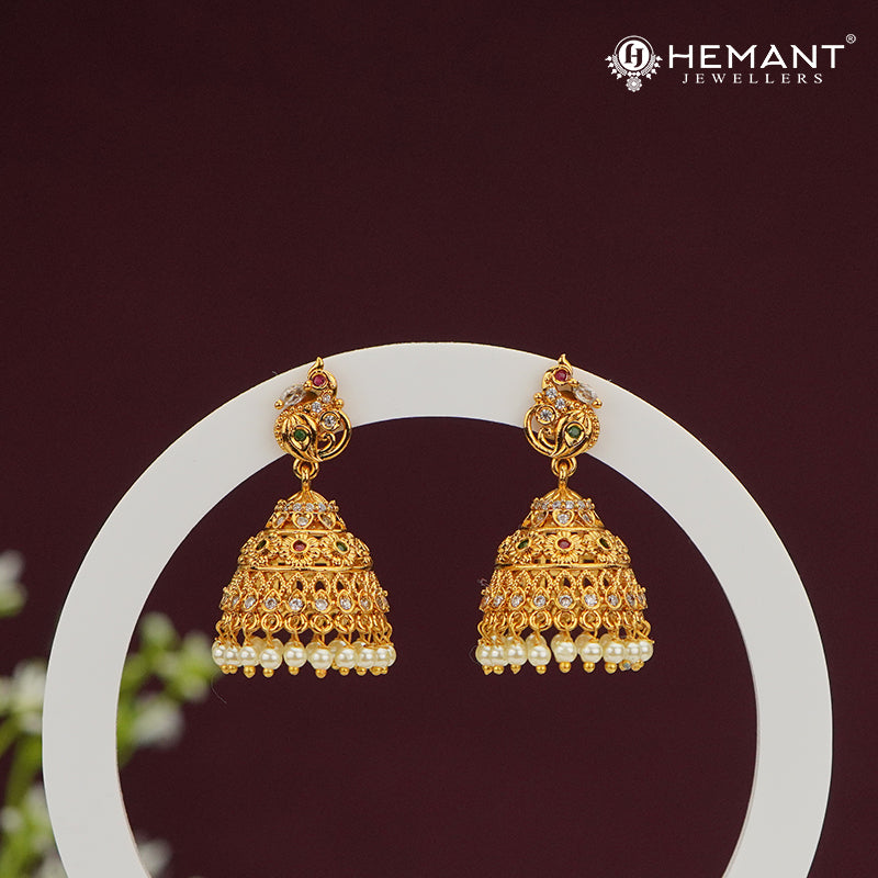 Unit price perTraditional dome-style jhumkas with vibrant stones and a pearl-laced base – statement elegance redefined.