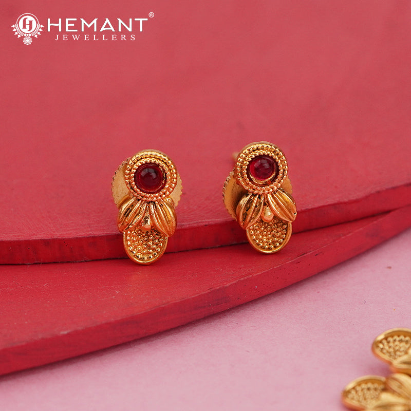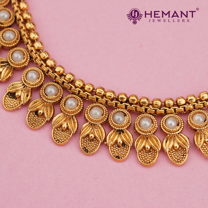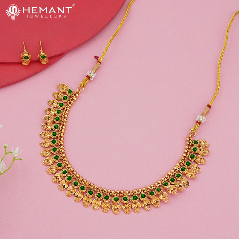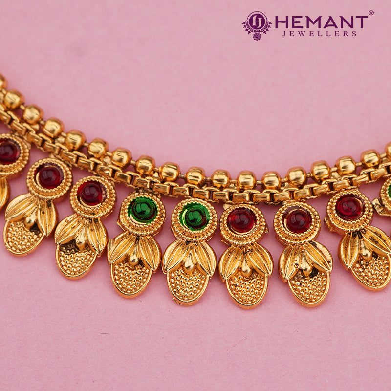 Bring a touch of timeless elegance to your look with this beautifully crafted Leaf Motif Red-Green Necklace Set by Hemant Jewellers. The necklace showcases a symmetrical pattern of embossed gold-finish leaf charms, each interspaced with vibrant red and green imitation stones for a rich ethnic appeal. The dual-tone stone placement adds vibrance while the intricate detailing reflects South Indian craftsmanship.