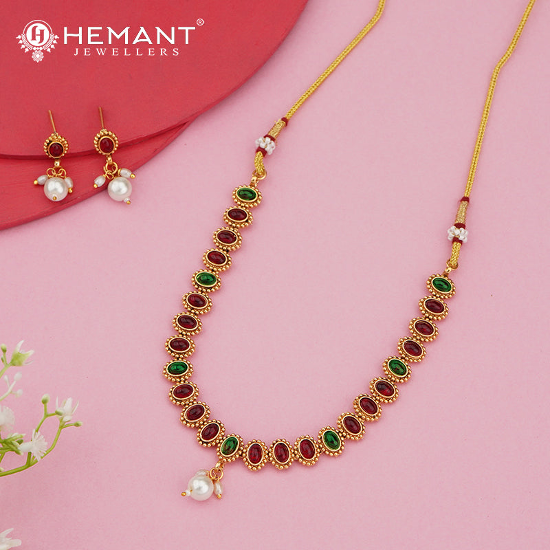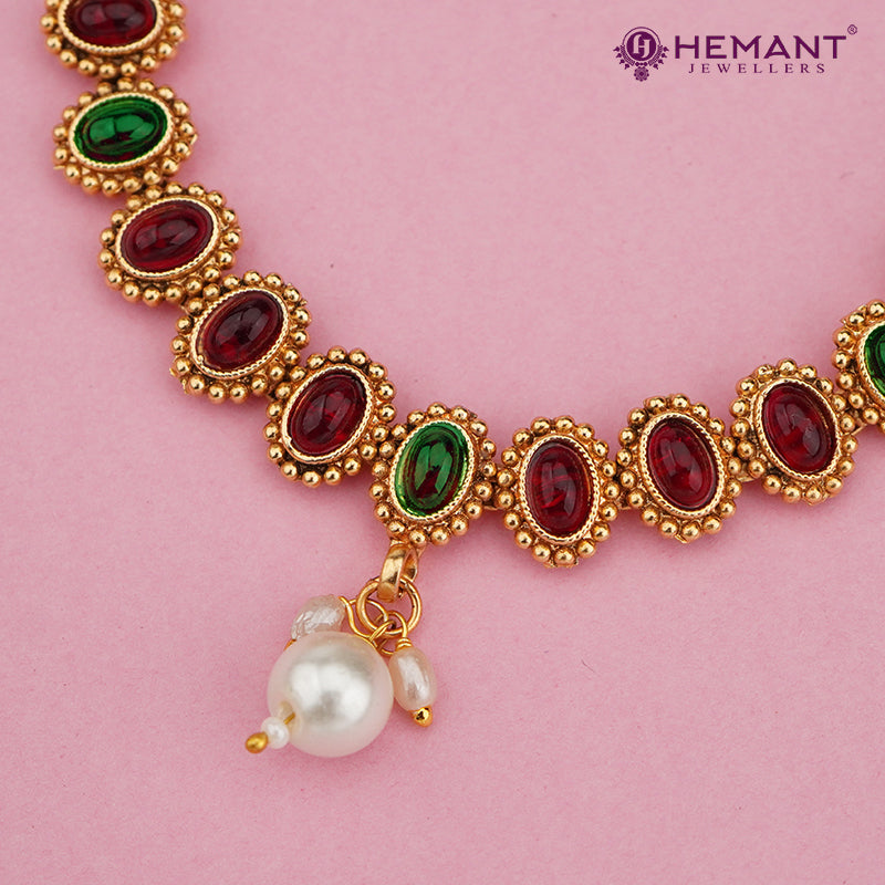 Graceful and vibrant, this necklace set features a series of oval-shaped red and green stones set in antique gold-finish bezels, linked seamlessly to form a uniform and rich neckline piece. A single pearl drop charm at the center adds a subtle yet classic accent.