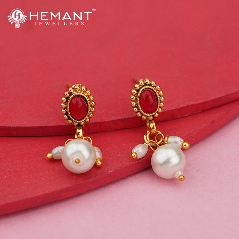Paired with matching oval stud earrings featuring similar pearl danglers, this design blends understated charm with festive appeal.