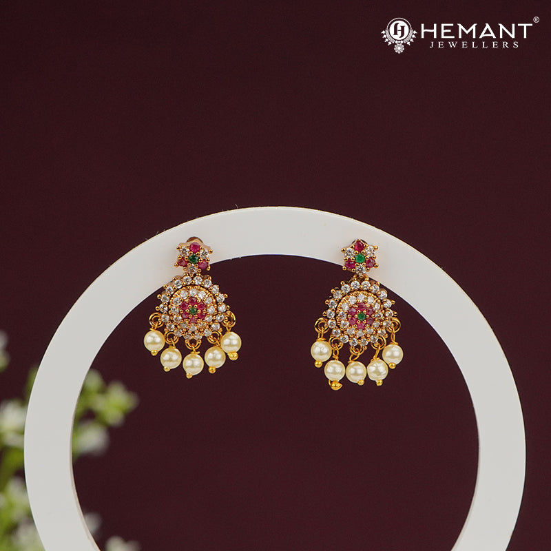 The lower edge features classic pearl danglings that enhance its traditional charm, while the top is adorned with a delicate multi-stone floral motif that beautifully blends with the centerpiece. These earrings bring together tradition and celebration in a compact yet eye-catching design.