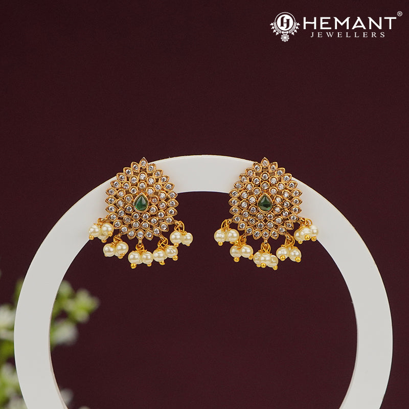 Finished with delicate pearl hangings, these earrings blend richness and tradition, perfect for enhancing both bridal and festive attire. Their round structure flatters all face shapes and adds just the right amount of opulence.