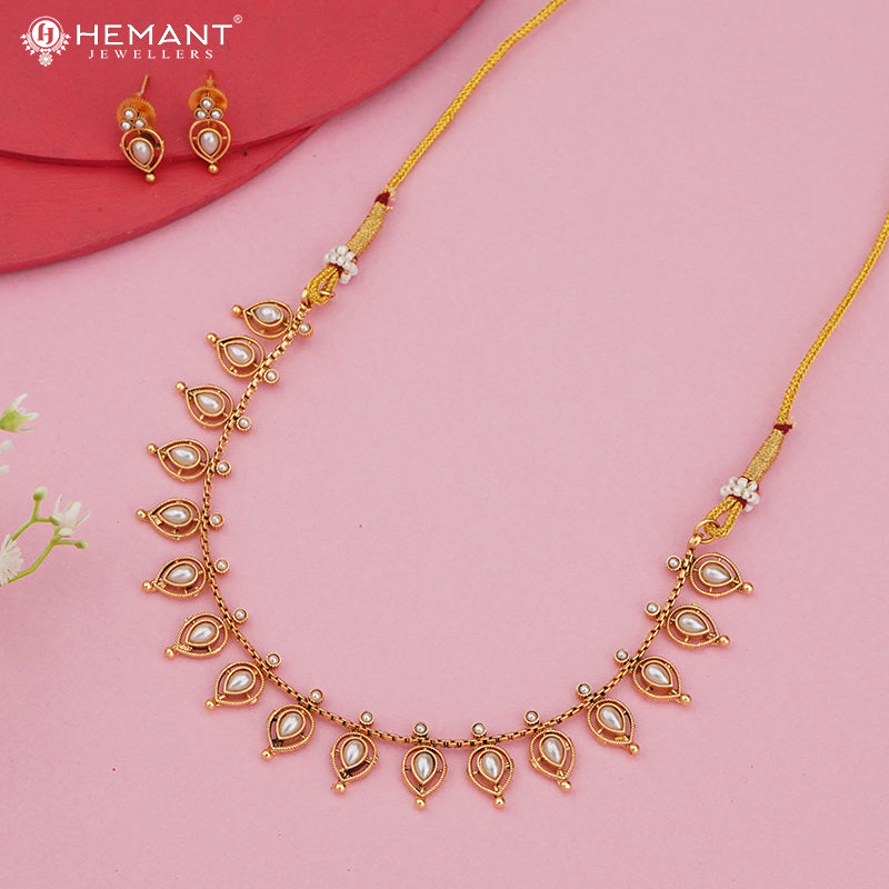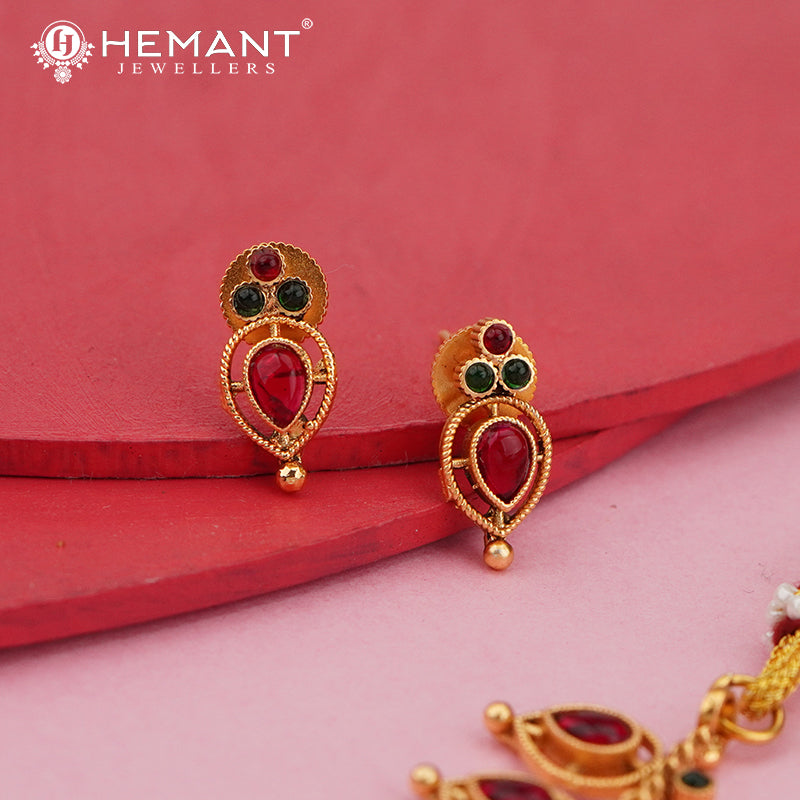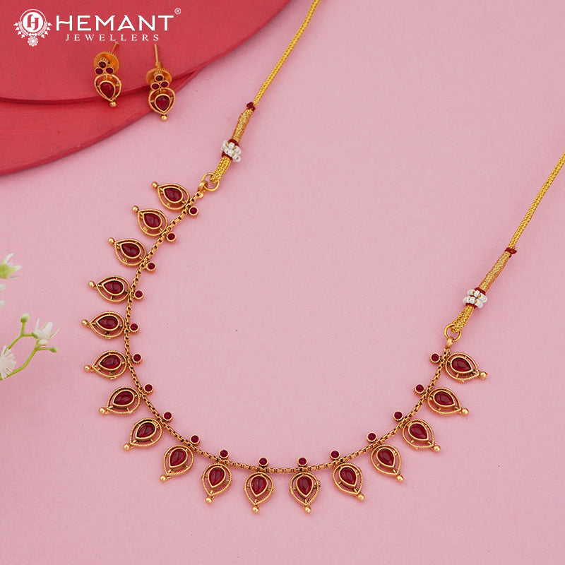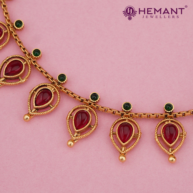 Infuse charm into your festive attire with this Teardrop Red-Green Stone Designer Necklace Set from Hemant Jewellers. The necklace features a graceful chain adorned with alternating teardrop-shaped red stones and tiny green stone accents, perfectly balanced to create a harmonious and eye-catching rhythm. Paired with delicately matching teardrop earrings, this set speaks volumes through its subtle elegance and traditional design.
