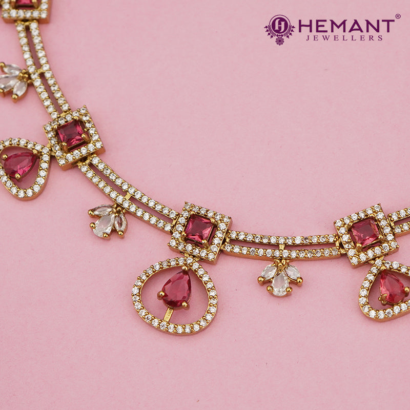 Graceful and modern, this necklace set is designed with blooming floral clusters crafted from white AD stones and deep green centers. Delicate vine-like curves support bright ruby-toned triangular motifs, adding structure and dimension to the design. The centerpiece features a bold arrangement of flowers, ending in a floral hanging for added charm.