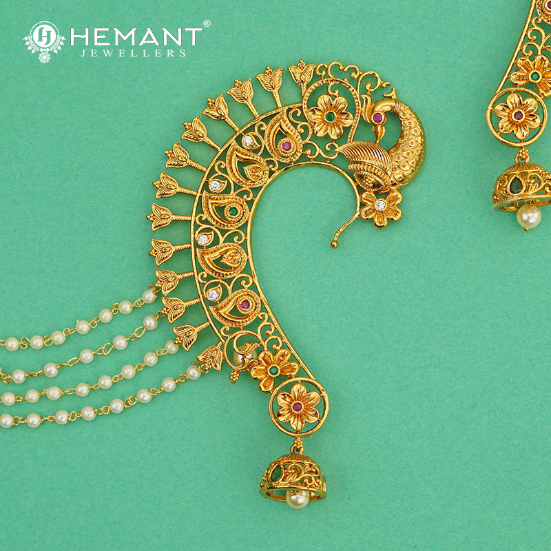 Unit price perStep into the spotlight with this exquisitely crafted ornamental Mayur (Peacock) Design Ear Cuff and Kaan Chain set. This statement piece captures the intricate artistry of traditional Indian jewellery design, focusing on detailed craftsmanship. The central feature is a majestic peacock motif gracefully positioned on the curve, surrounded by delicate golden filigree work incorporating traditional floral and paisley patterns. Each element is meticulously designed, featuring fine detailing enhanced by subtle accents of colored enamel and sparkling Kundan stones, giving the piece a rich and authentic appearance. This ear cuff is perfectly suited for grand events, offering a magnificent presence without the weight of pure gold jewellery.