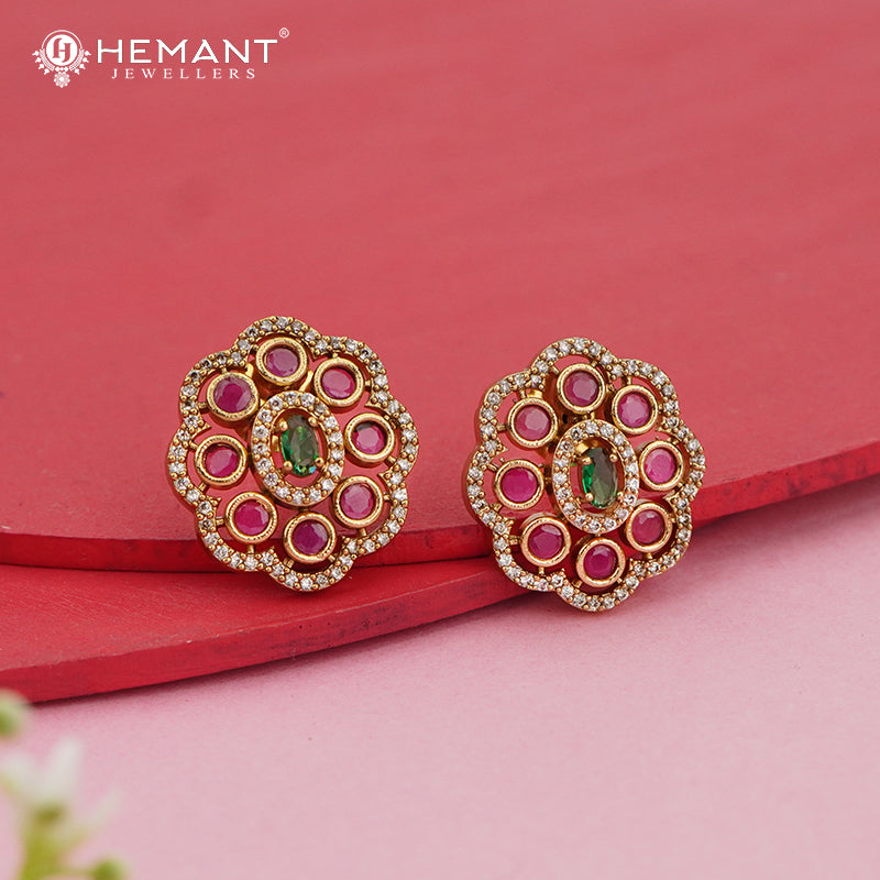 A perfect blend of antique finish and gemstone vibrancy, this piece radiates festive grace and is ideal for weddings, family gatherings, or traditional festivities. The green oval center stone adds a rich focal point, while the surrounding ruby-toned circular accents enhance its festive appeal.
