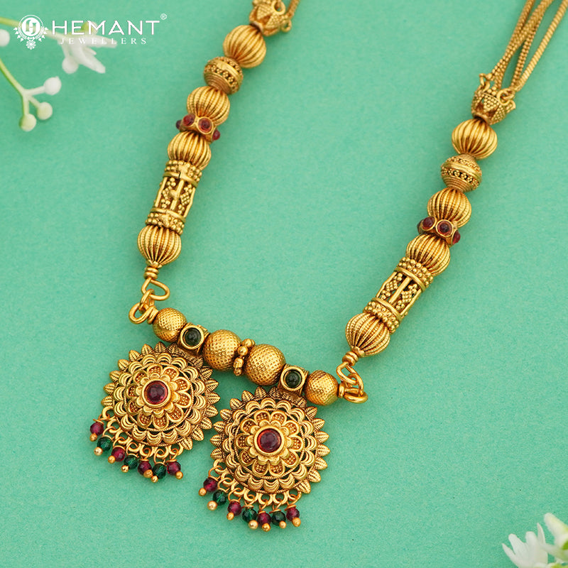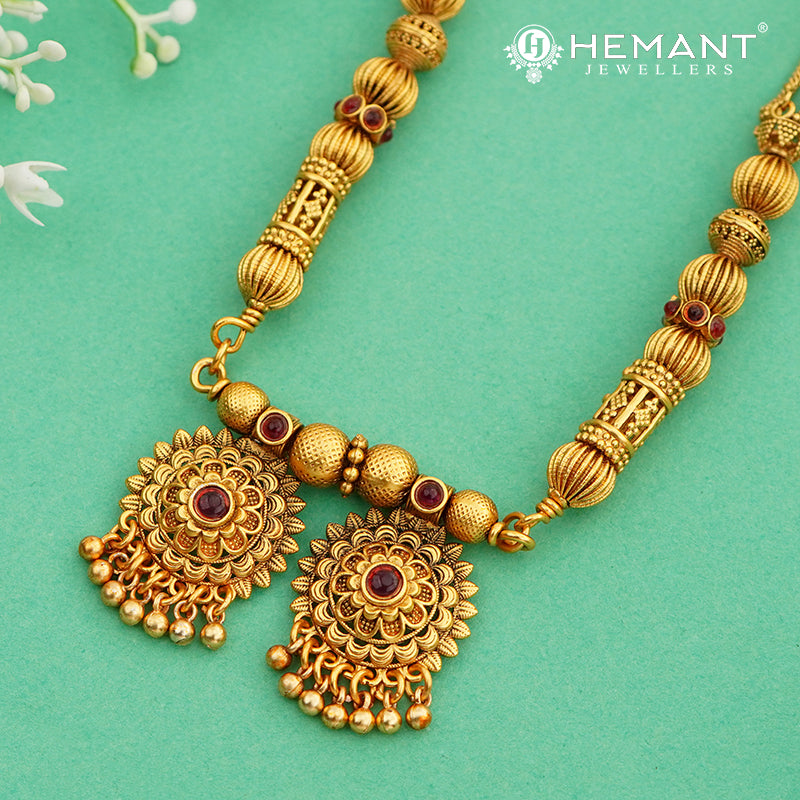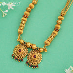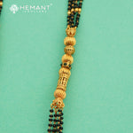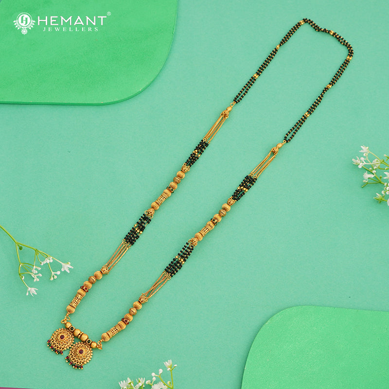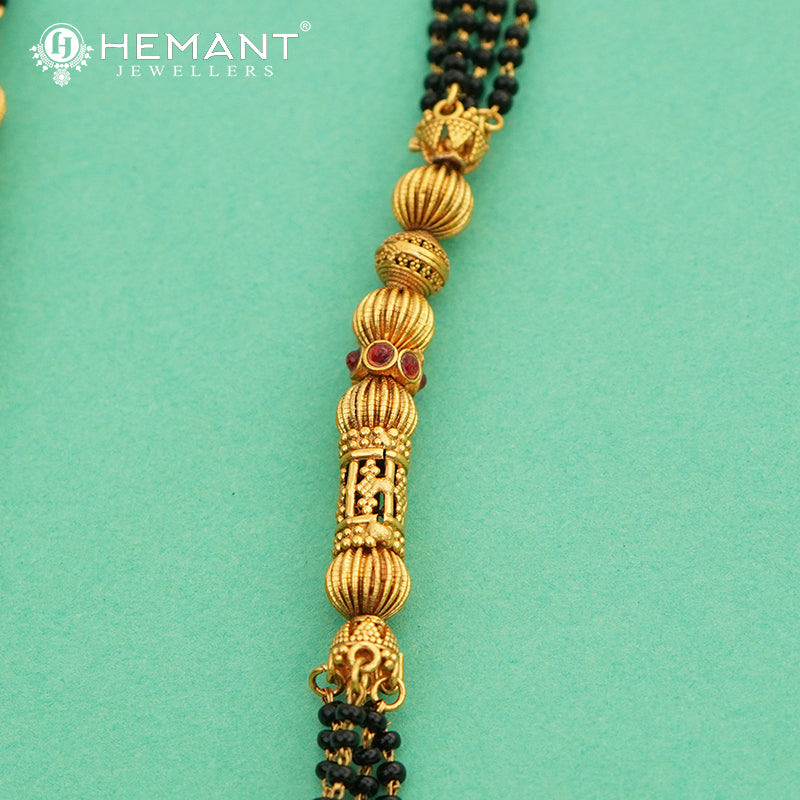 Unit price perA striking mangalsutra with triple-chain black beads, antique golden beads, and dual round pendants adorned with ruby stone detailing.