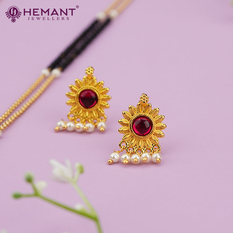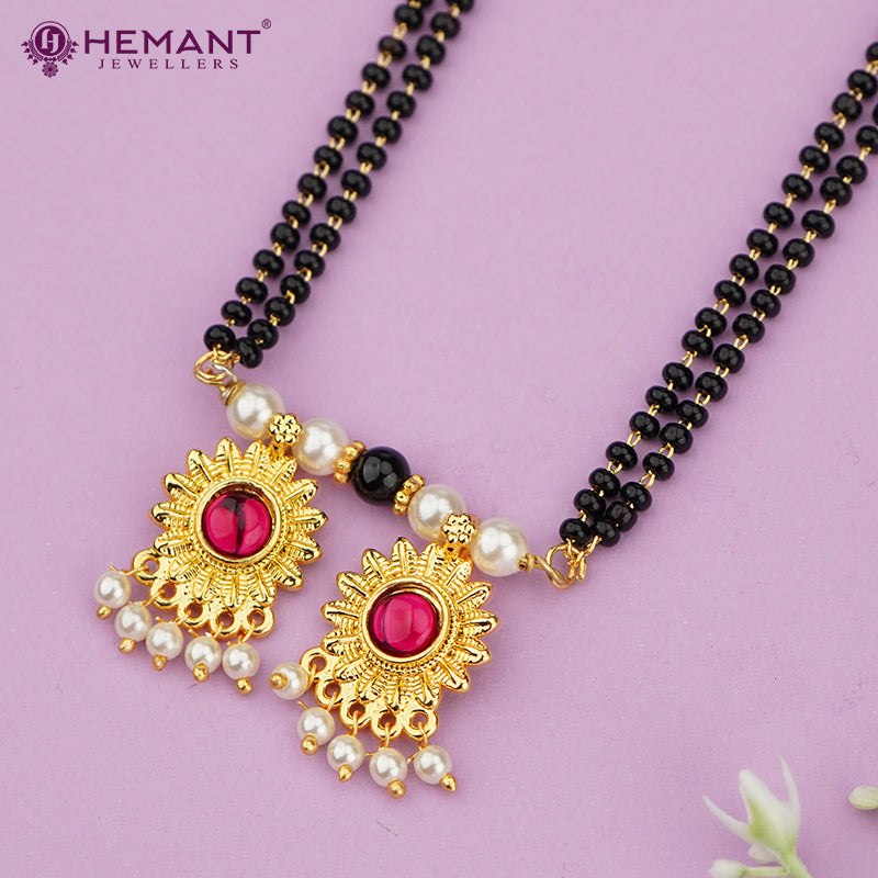 Unit price perEmbrace the beauty of tradition with this Maharashtrian-style double vati mangalsutra from Hemant Jewellers. Featuring two intricately crafted pendants inspired by the iconic vati (वाटी) design, this mangalsutra is adorned with black beads, gold-plated chains, and delicate pearl hangings. It’s a timeless symbol of elegance and commitment.