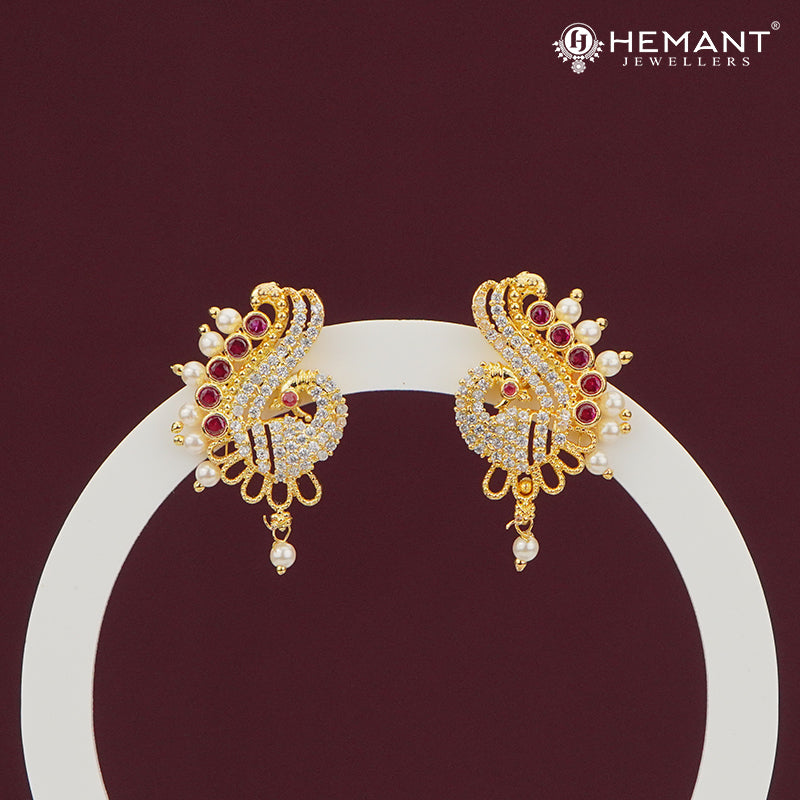 Inspired by the elegance of a peacock, these stunning earrings feature a majestic curve set with shimmering American diamonds and ruby-red stones. Accented with small pearls, the design radiates a royal charm that’s perfect for weddings, receptions, or traditional celebrations. The micro gold-plated finish adds a rich, authentic look, making these earrings a must-have in every ethnic collection.
