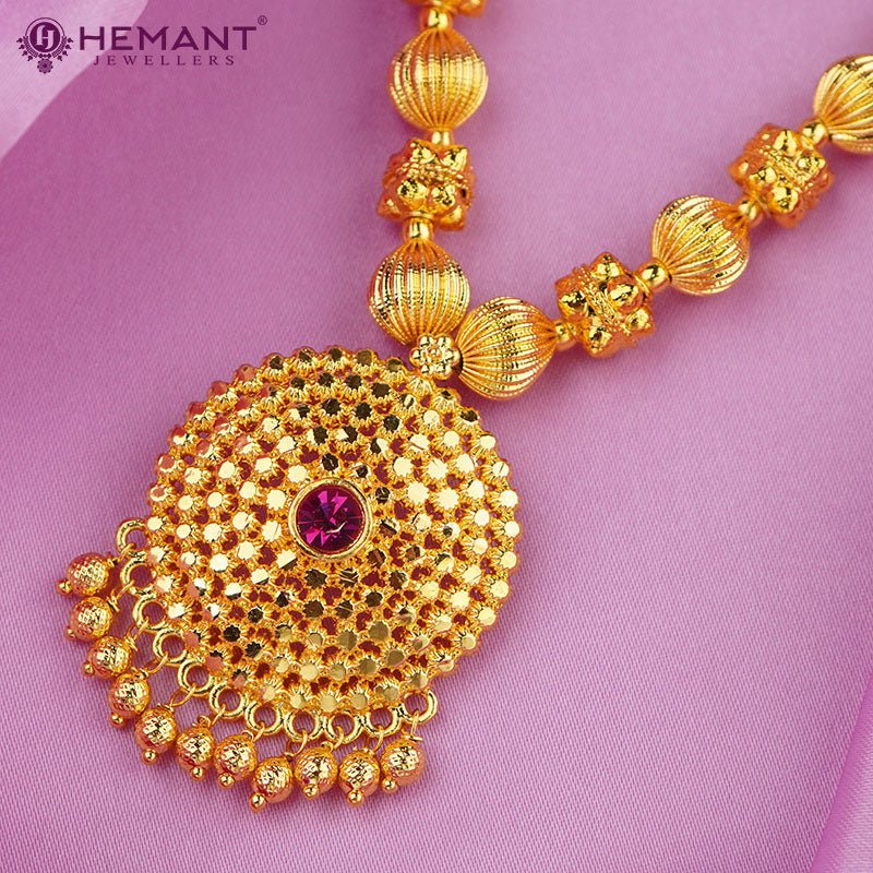 Unit price perCelebrate the essence of Maharashtrian heritage with this intricately crafted Kolhapuri Saaj-inspired Jav Mani Mala. Adorned with beautifully carved spherical beads and a statement round pendant studded with a rich ruby-pink stone at the center, this piece radiates cultural charm. The detailed layered pendant design and tiny ghungroo-style drops enhance its ethnic appeal, making it a perfect fit for traditional wear. Finished in glossy forming gold polish, it blends grandeur with daily elegance.